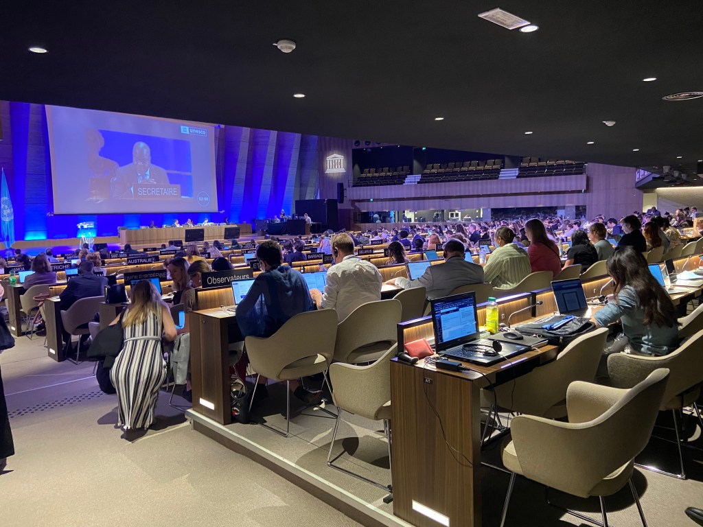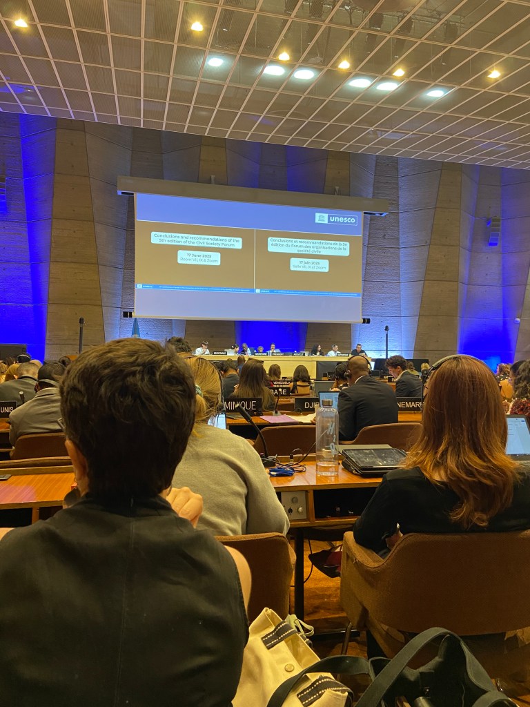 Ci-dessous, la délégation de la FIJC lors de la Xe conférence des parties de la Convention 2005 de l’UNESCO en juin 2025.